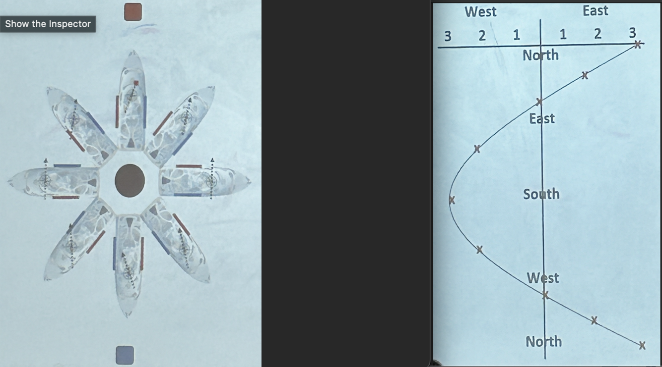 Arrows as the boat spins around, north facing point is deflected to the blue.