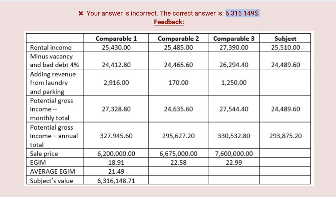 You have a buyer who is interested in an income property (See Handout A4). Using the comparables you found (Handout A1, A2 and A3) in the same area, please value the building using the Effective Gross Income Multiplier (EGIM) method. Select the answer that is closest to the value of the subject.