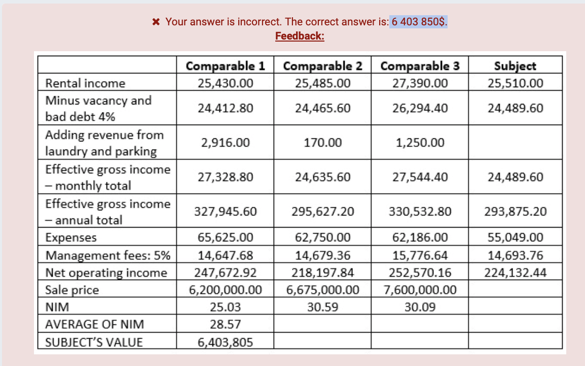 You have a buyer who is interested in an income property (See Handout A4). Using the comparables you found (Handout A1, A2 and A3) in the same area, please value the building using the Net Income Multiplier (NIM) method. Select the answer that most closely matches the value of the subject.