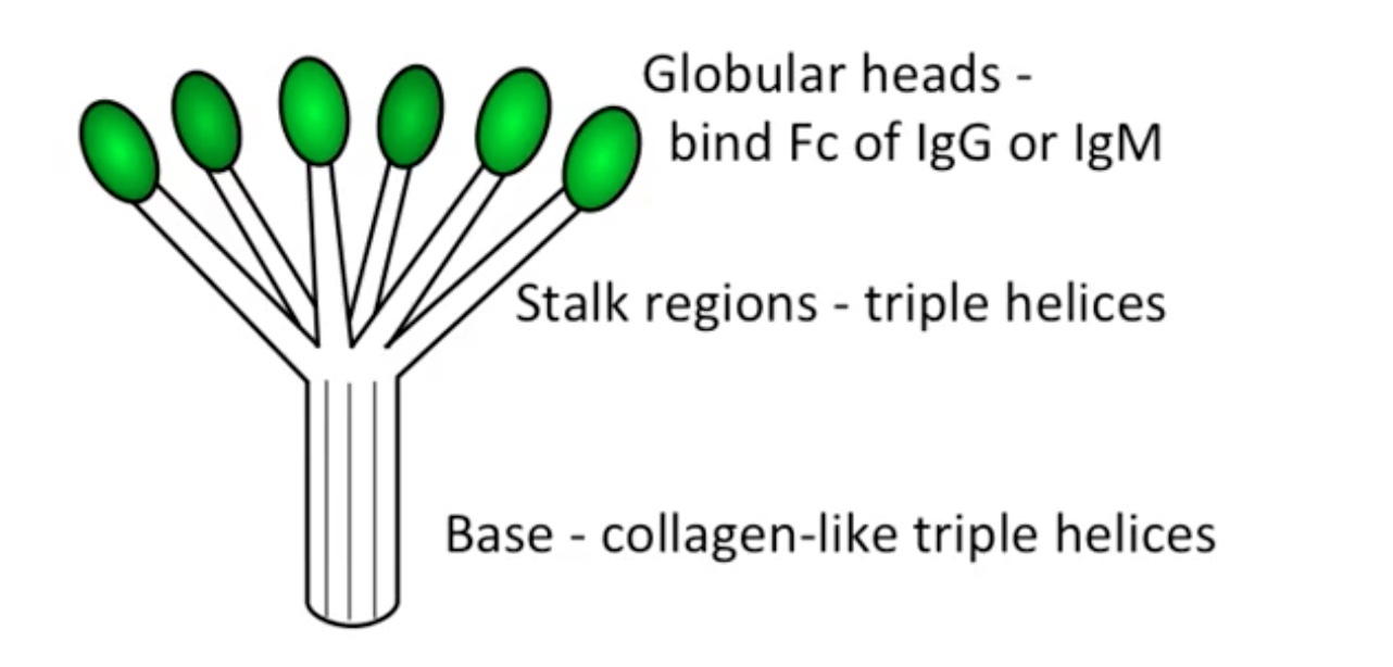 IgG/M molecules bound to ? surface. ? globular heads bind to ? region of IgG/M. Once multiple globular heads are bound the activation of complement proceeds