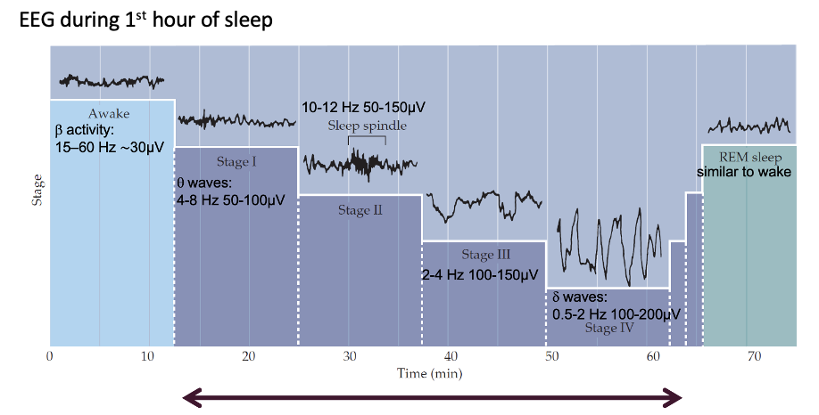 An EEG recording was taken during the 1st hour of sleep, tell me the different waves seen over the one hour period, and at what times they were seen. Tell me about the frequency range for each wave type