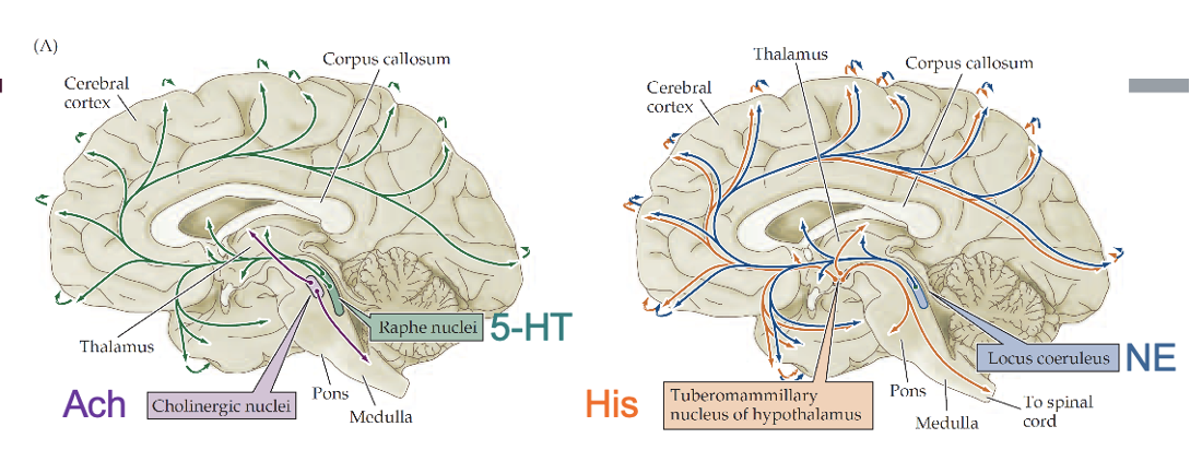 Tell me 4 areas of the brain associated with arousal and what are the NT expressed/secreted from here?