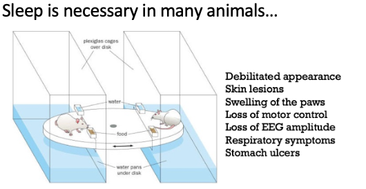 An experiment was done on rats to look at the effects caused by depriving one of sleep. The experiment had 2 rats on a disc. One rat was not allowed to sleep where as the other was. When the no sleep rat would fall asleep, the disc it was on would spin and the rat would fall in the way and wake up. What are some of the side effects the rat experienced from sleep deprivation?