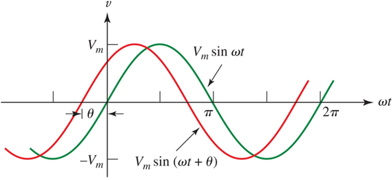 In sinusoidal signals, what does ‘v2 leads v1 by q’ mean?
