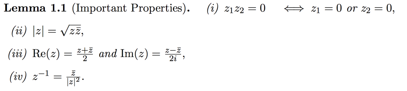 What is the Lemma about four of the useful and basic properties of complex numbers?