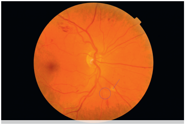 Ischaemic swelling of the optic nerve layer causes a white, round or patchy appearance (circled)