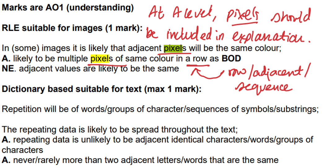 Explain why RLE is more suitable for compressing images and dictionary-based methods are more suitable for compressing text. (2 marks)