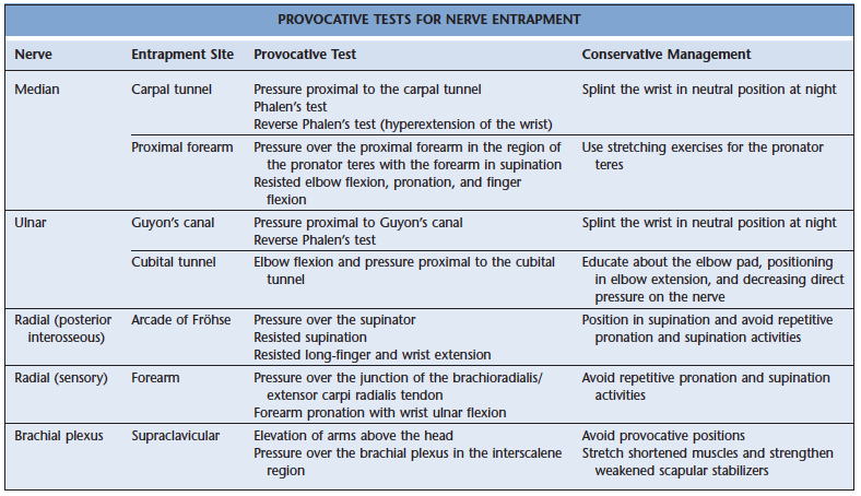 Describe provocative tests for various peripheral nerve compression neuropathy
