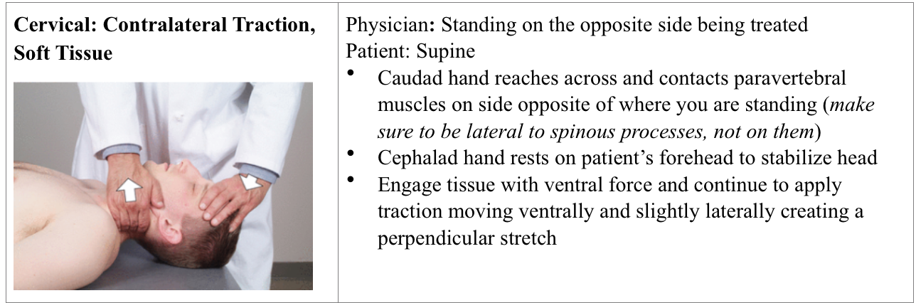 Cervical: contralateral traction, soft tissue