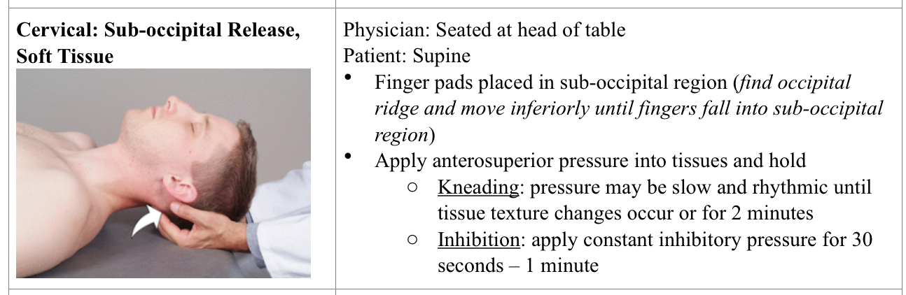 Cervical: sub-occipital release, soft tissue