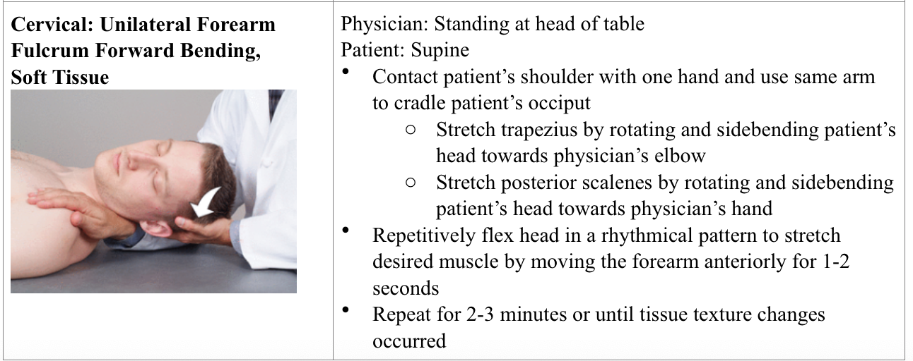 Cervical: unilateral forearm fulcrum forward bending, soft tissue