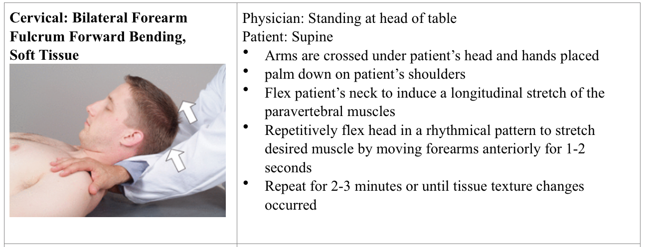 Cervical: bilateral forearm fulcrum forward bending, soft tissue