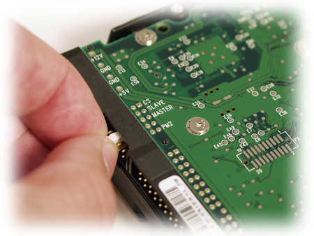 Master/slave jumpers on a hard drive on a PATA hard drive.