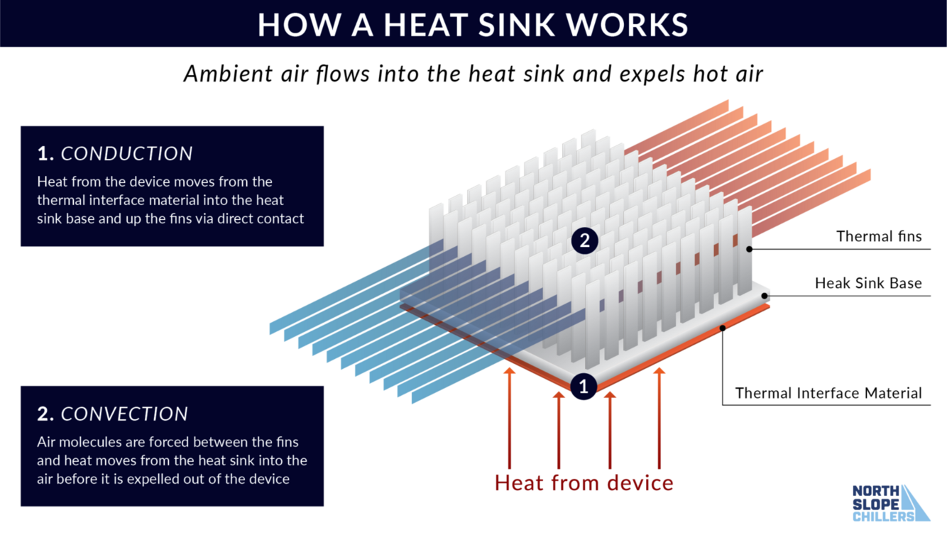 Passive cooling utilizes natural conduction, convection, and radiation to cool a component. The most common type uses a heat sink which is a block of heat-conductive metal such as aluminum affixed to a chip with some heat-conductive thermal paste. The heat sink has spikes or baffles that increase its surface area. Heat wicks away from the chip into the heat sink and dissipates into the air.