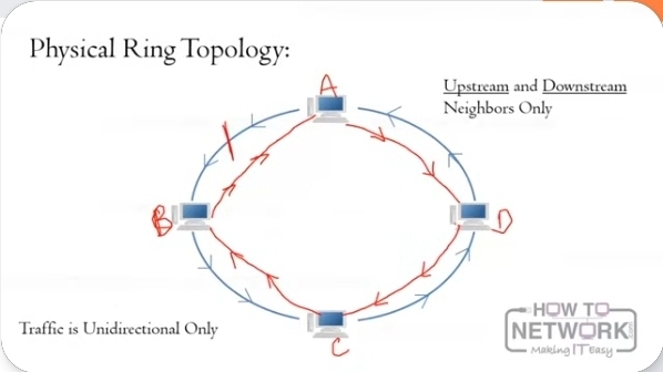 network configuration where each device is connected to exactly two other devices, forming a continuous loop or ring.