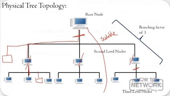 network configuration that combines elements of both star and bus topologies. It resembles a tree structure, with a central “root” node connected to one or more intermediate nodes, which in turn connect to other nodes, forming a hierarchy.