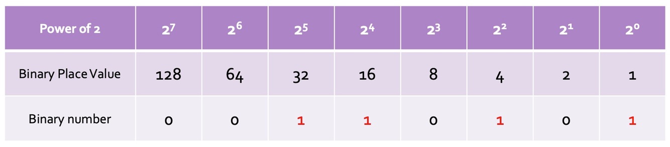 Draw out a table with binary place values to make a binary / denary conversion for the binary 00110101 and calculate the denary for this