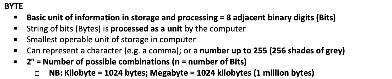 Define BYTE. How many in a kilobyte / megabyte? Formula for calculating?
