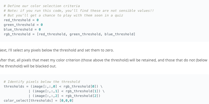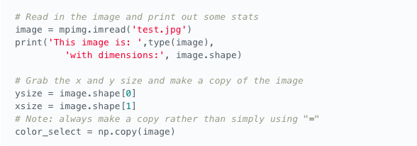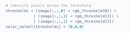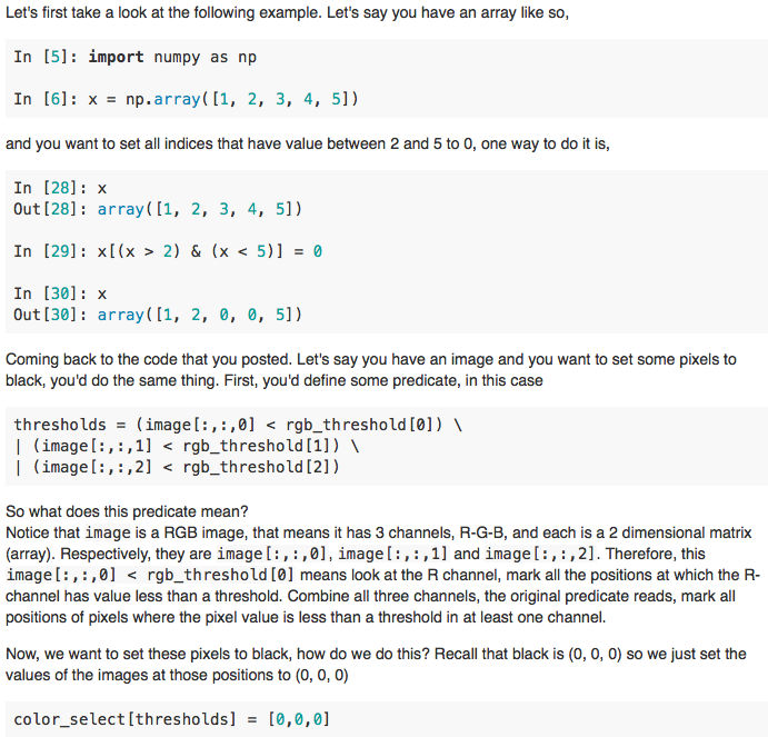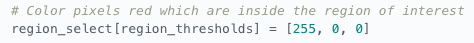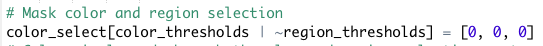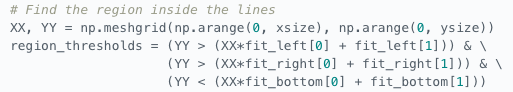 run np.meshgrid the size of the image. This just creates a grid of x,y coordinates(pixels). Then use a predicate filter(with AND operator) to grab the pixels that meet a certain criteria. In this example, the filter looks for y values greater than far left and right lines AND less than the bottom line. Rememeber y values increase as you move down and image from the upper left.