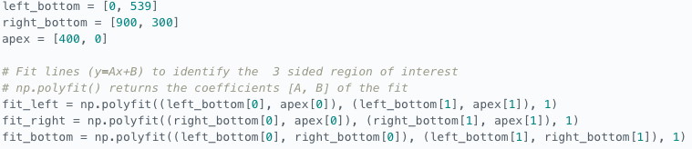Assuming camera is fixed and front facing, a certain region of interest should identify the lane lines while blacking everything else out. Can you any type of polygon to identify region, but triangle is most basic