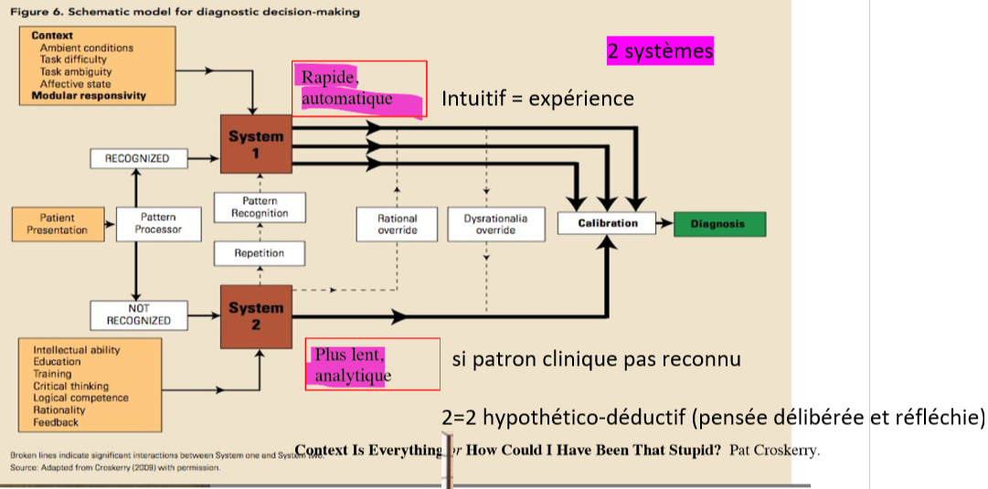 1-intuitif (induit par expérience, rationalité limitée, heurisituqe (rapide et intuifi), patrons cliniques, pensée inconscient)
