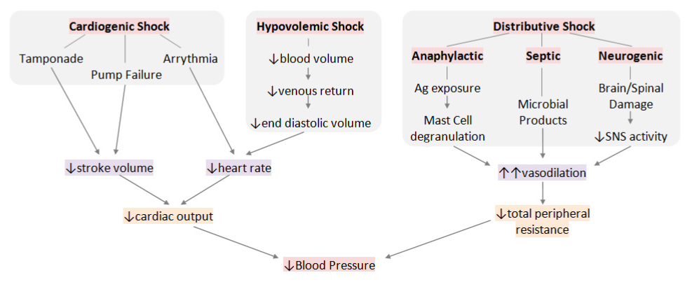 List the types of shock and summarise their pathogenesis.