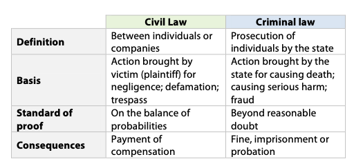 Differentiate between civil and criminal law.