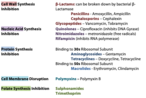 Outline the mechanisms of some major antibiotics.