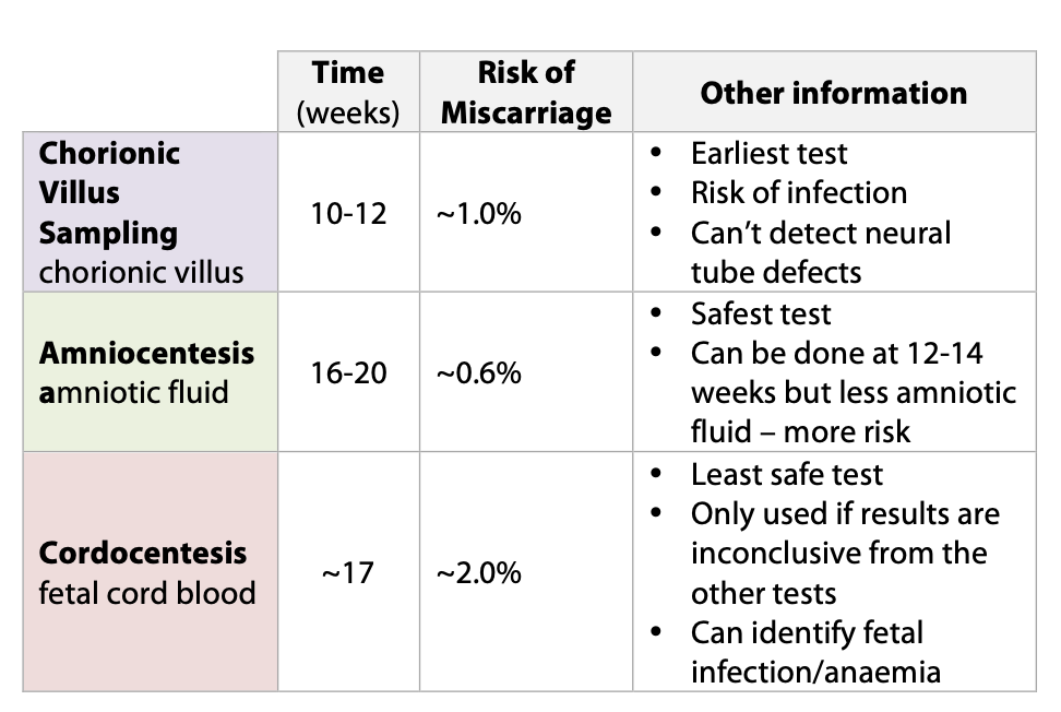 Outline 3 different samples that can be taken from a foetus to test for genetic disorders.