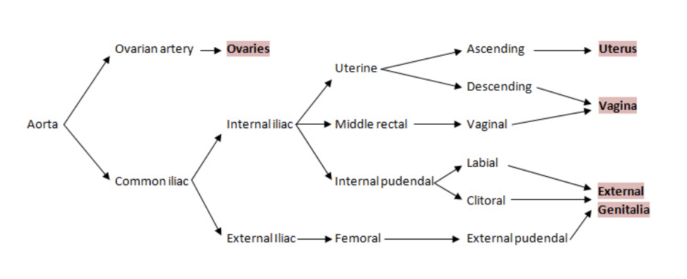 Outline the blood supply to the ovaries, uterus, vagina and external genitalia.