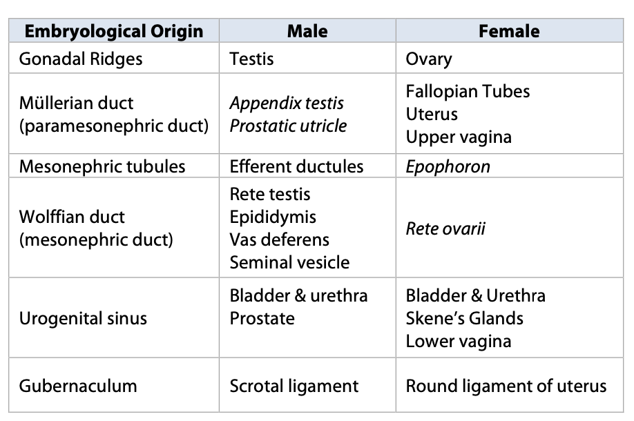 List the embryological origins of male and female reproductive organs, and what they develop into.