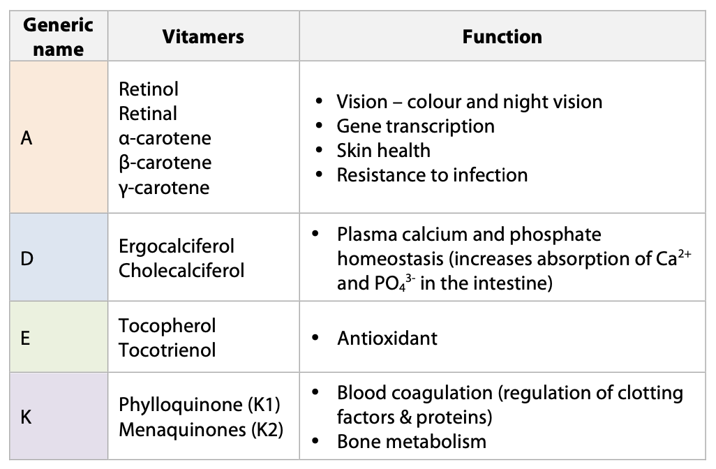 Give the names and functions of the fat-soluble vitamins.