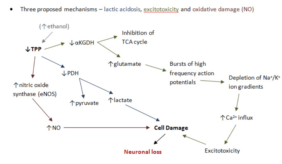 Describe the pathogenesis of Wernicke-Korsakoff syndrome.