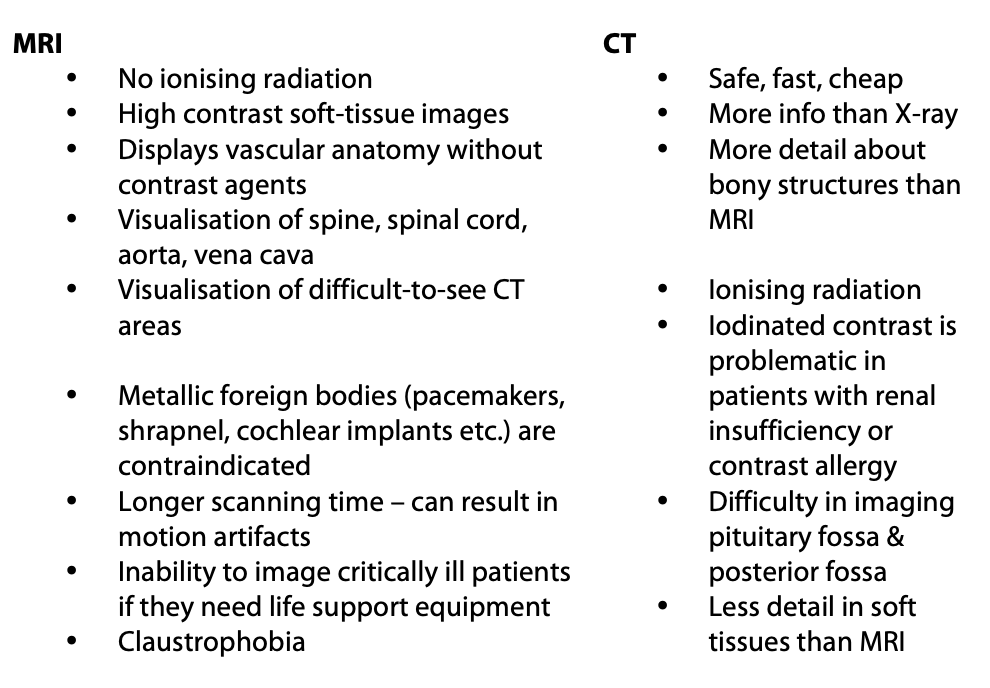 Give some advantages and disadvantages of MRI and CT.