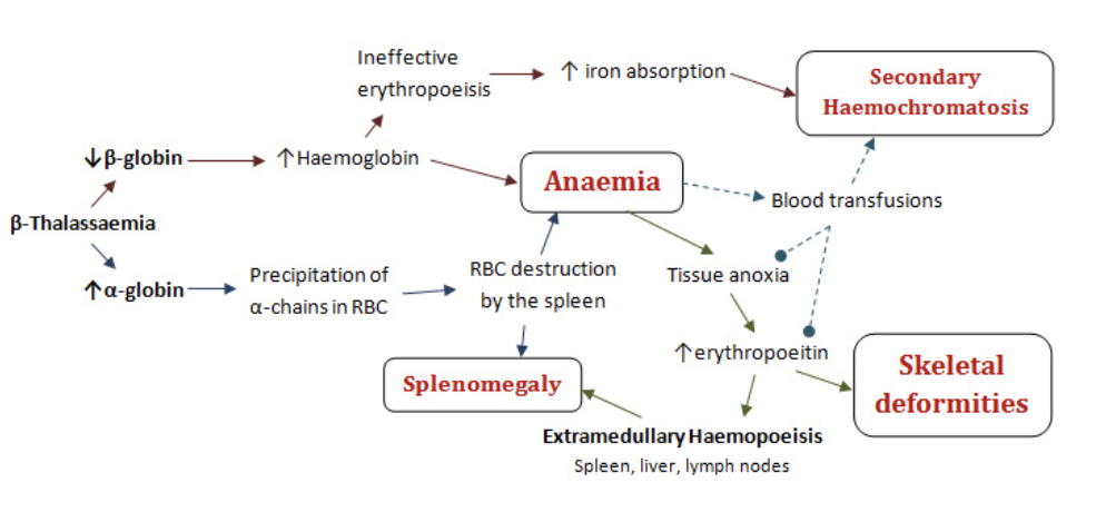Summarise the pathogenesis of β-Thalassaemia.