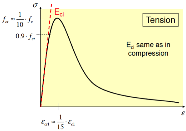 Sketch and label the stress-strain diagram of concrete in tension. Also compare it with concrete in compression (curve and significant values)
