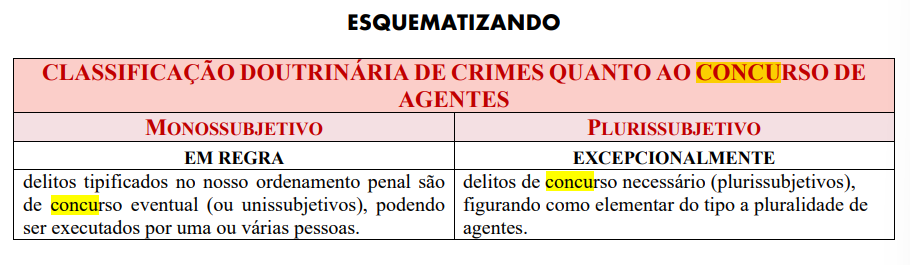 Desse modo, quanto ao concurso de pessoas, o crime poderá ser classificado em monossubjetivo ou