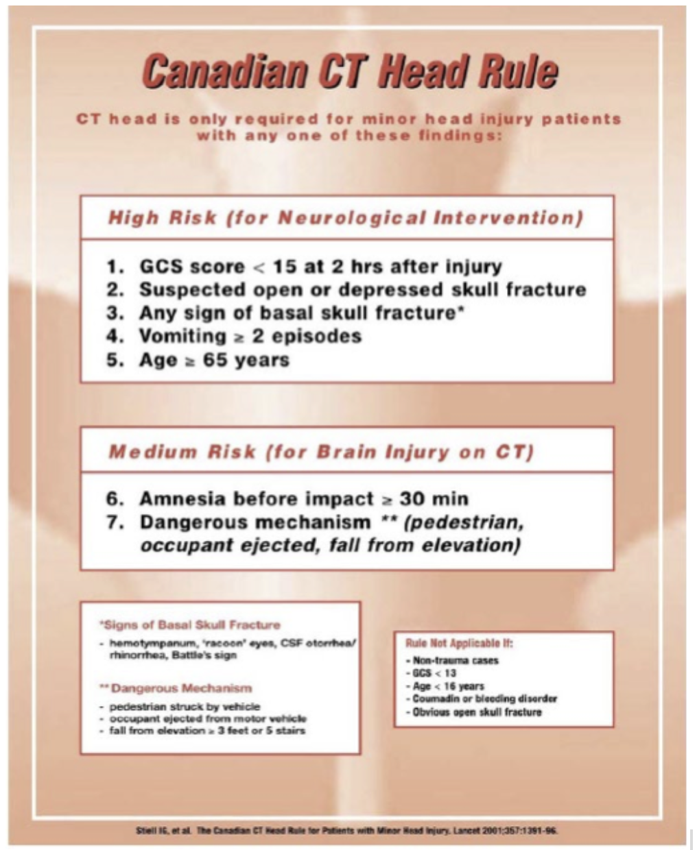 Medium Risk: any sign of basal skull fracture, large/boggy hematoma of scalp, dangerous mechanism of injury