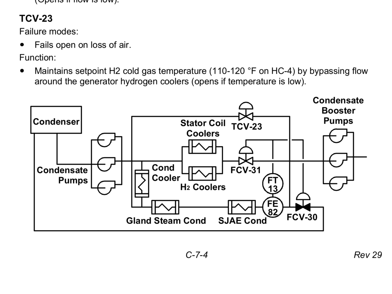 FCV-31 - downstream of H2 cooler and stator coil coolers. Controls flow through GSC and SJAEC (parallel flowpath) 5500-6000 gpm. (low flow -> shut, forcing more flow to loads). Mechanical stop @ 36 deg (minimum cooling to MG coolers) (also opens for 3 min on LDA and MFP trip)
