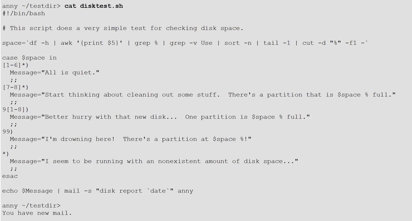 echo “At least one of my disks is nearly full!” | mail -s “daily diskcheck” root