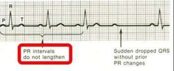What type of AV block is characterized by a suddenly dropped QRS?