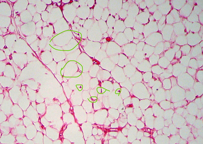 Grande, redondo, grande gota de grasa que ocupa todo su citoplasma y nucleo achatado en la periferia