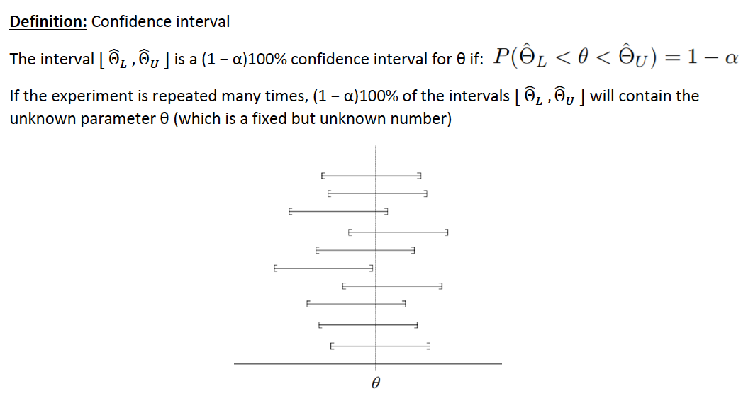 A confidence interval is an interval [ Θ̂𝐿 ,Θ̂𝑈 ] which with high probability will come to contain the value of the unknown parameter θ.