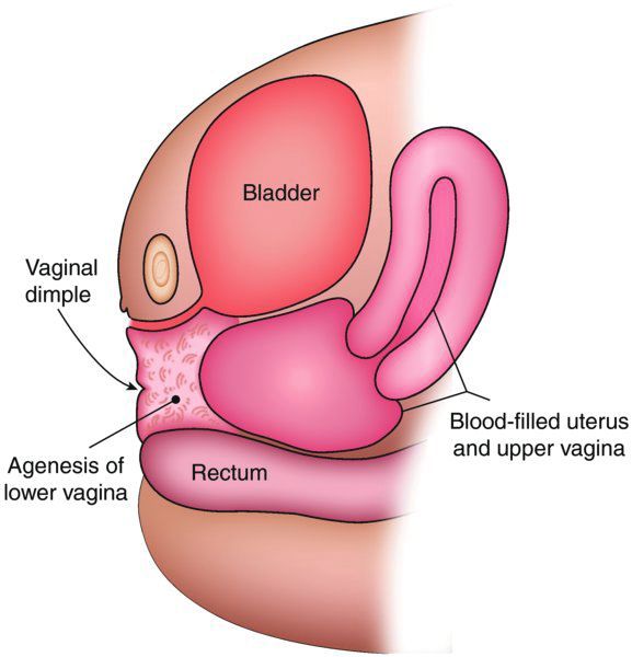absence of vagina- ovaries remain in place so female sexual hormones are unaffected