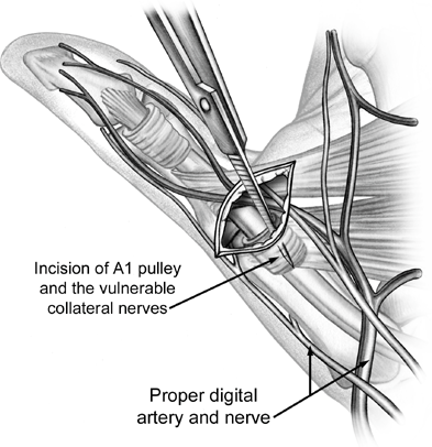 Digital nerve injury whilst doing the A1 pulley release- high proximity to flexor tendon and A1 pulley
