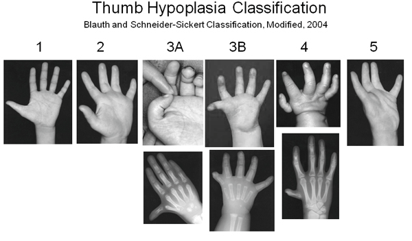 4= Floating thumb, attach to hand by skin alone = Thumb amputation/ pollicization