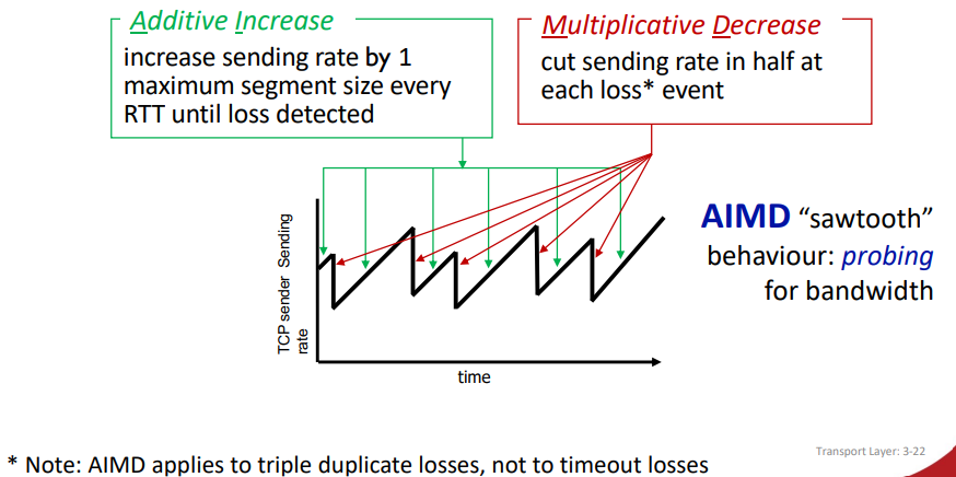 - on loss event, ssthresh is set to 1/2 of cwnd just before loss event
