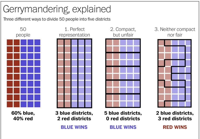 The below diagram from the Washington Post shows that depending on how voters are divided up into districts can result in a big potential change in the number of constituencies that each party would gain substantially. In the USA, these boundaries are decided on by the state government, which is controlled by a party. It is therefore in its interests to ‘gerrymander’ the boundaries to give it the best political circumstances for success. This has led to very oddly shaped and sometimes not even geographically contiguous districts