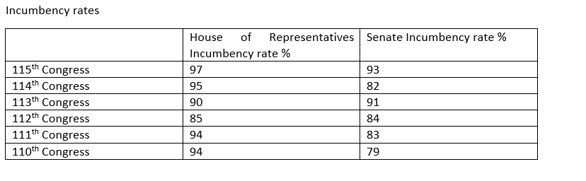 Being the incumbent in an election can hold significant advantages over your political challengers. Perhaps the most important is the name-recognition that currently holding office brings. Elections are an expensive business in the US, in 2016 the average campaign cost of winning a Senate seat was $10.4 million, an increase of 25% on 2014. Equally, the campaign cost of winning a seta in the House of Representatives was over $1 million. To achieve this level of funding is far simpler when the candidate is already a known quantity. In 2016, incumbents in the Senate raised an average of $12,708,000 compared to just $1,599,714 on average by challengers. This is a vicious cycle, incumbents have name recognition and therefore can raise more and in raising more incumbents can work to further enhance their name recognition.