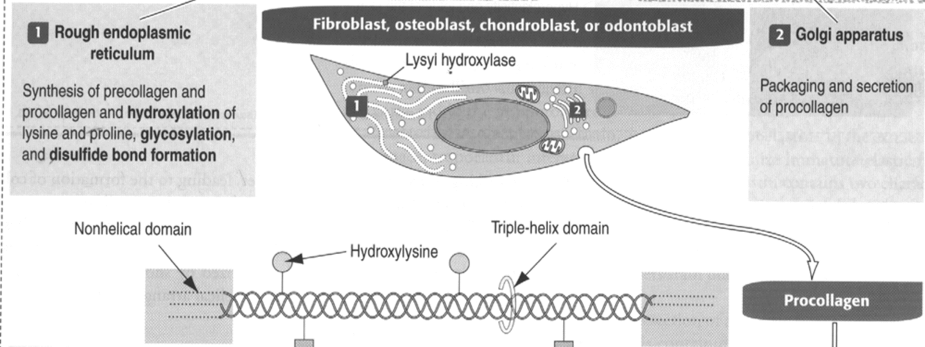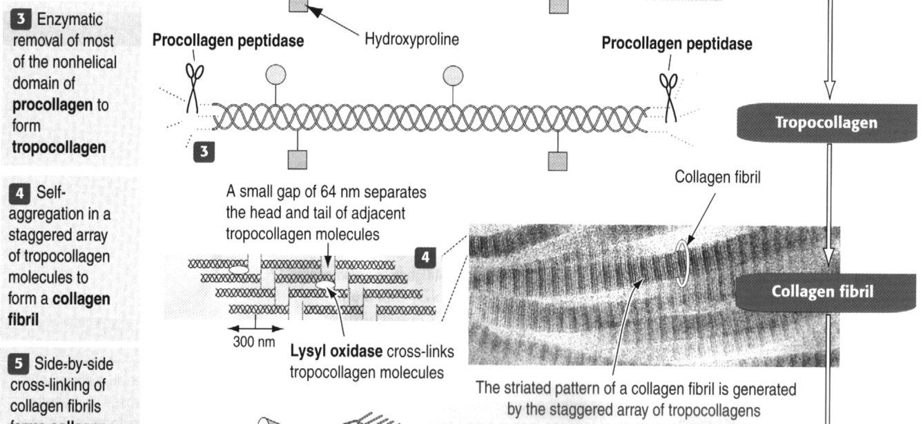 Extracellular cleavage of peptides from procollagen allows assembly of tropocollagen molecules into